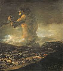 Nel 1825 Ferdinando VII restaura l'assolutismo, e proprio per questa ragione Francisco Goya y Lucientes lascia Madrid e si trasferisce a Bordeaux, dove porterà a termine la sua proficua attività. In Goya si coordinano i due aspetti principali del movimento romantico, cioè la visione e l'approfondimento della conoscenza oltre confini della vita più profonda, e l'integrazione storica. "Il Colosso" (1808-12) è un "deus ex machina" che rasenta le sommità estreme del cielo e domina un orizzonte pieno di gente che scappa in ogni direzione: l'uomo è lasciato indifeso in preda alle forze devastatrici degli istinti. "Saturno mangia ferocemente il proprio figlio" (olio su tela, 146 x 83 cm. Madrid, Museo del Prado, 1821-23), proprio come agisce la Spagna con la propria gente.
